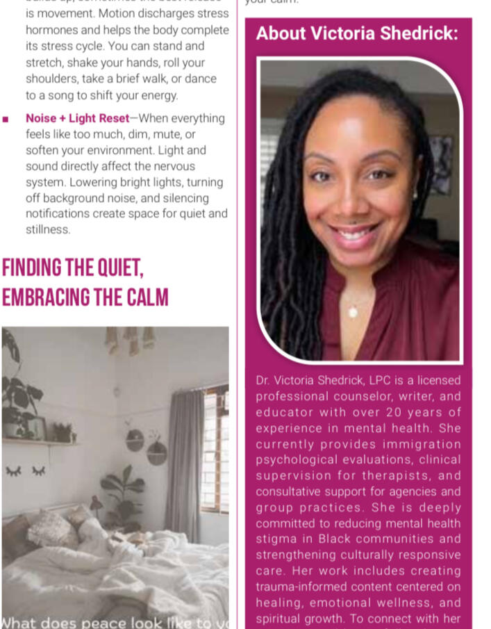 Dr. Victoria Shedrick is a therapist, writer, and speaker whose work centers on faith, emotional wellness, identity, and personal transformation. With a background in clinical practice and consultation, she translates complex psychological concepts into grounded, accessible insight that supports healing and growth.Her work spans books, digital resources, speaking engagements, and media platforms, offering compassionate guidance for individuals navigating grief, change, and renewal. Known for blending clinical wisdom with spirituality and cultural awareness, Dr. Shedrick invites others to slow down, reflect, and move forward with clarity and grace.