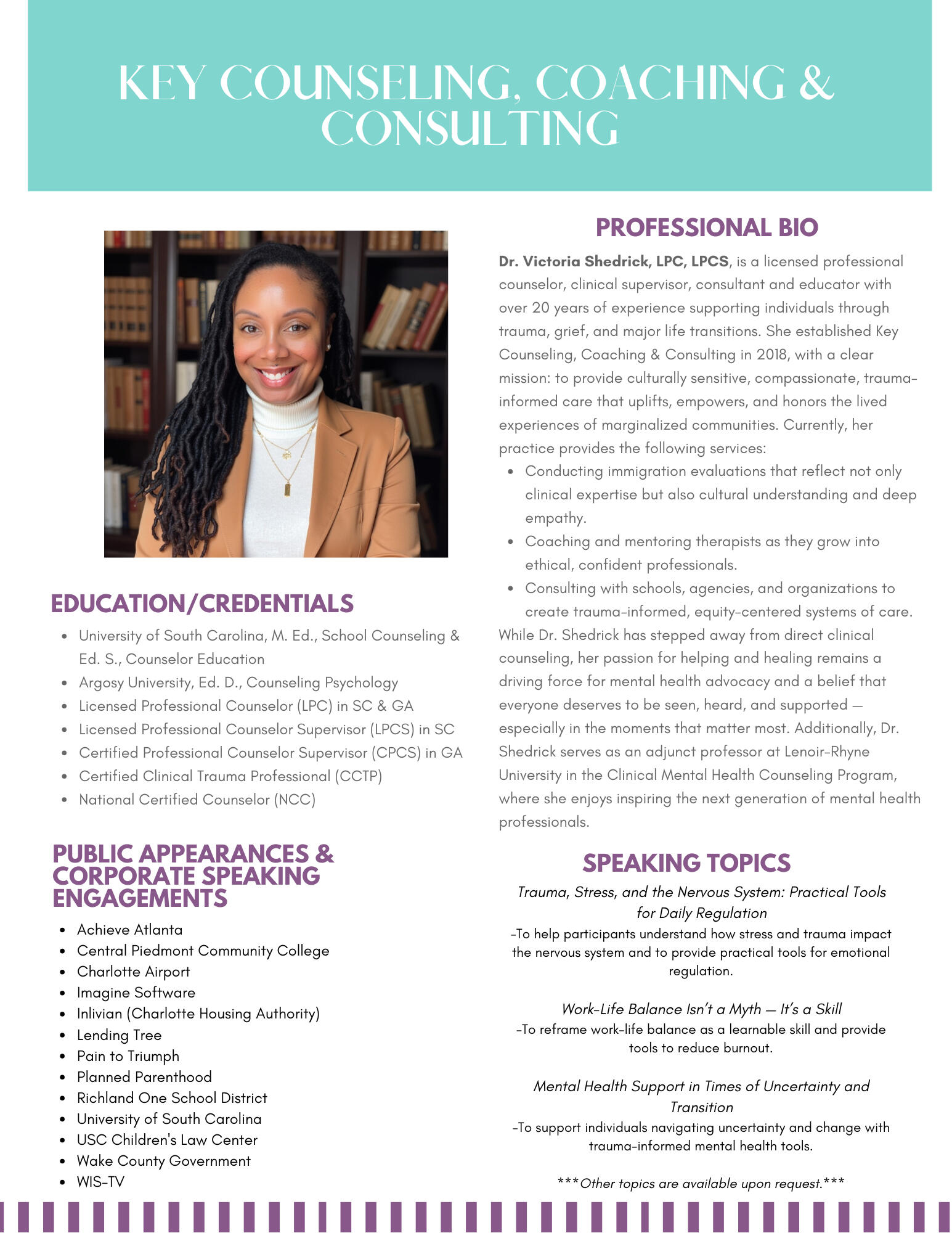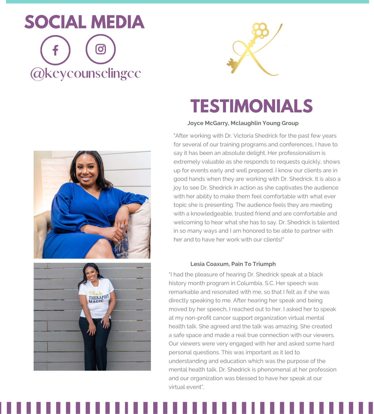 Dr. Shedrick speaks on topics including emotional healing, faith and mental health, grief, identity, and navigating life transitions with intention. She is a highly requested speaker for schools, agencies, and businesses, and has appeared on multiple podcasts and panels.Topics can be tailored to specific settings and audiences, from school-aged children to workplace groups and community organizations.You can also connect with Dr. Shedrick on TikTok and YouTube, where she shares culturally aware and relatable content with her unique style and personality.To book a speaking engagement or media appearance, please send a direct email using the icon below.